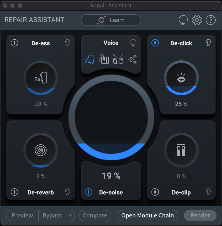 The handy “Learn” button creates a custom module/processor chain for your audio. It scans your audio and suggests custom amounts of optimization in each of the following modules: De-ess, De-click, De-reverb, De-noise and De-clip. Then you can preview the sound of those suggested settings as well as increase or decrease the amount of each module to taste. Then, when everything sounds good to you, simply click Render.